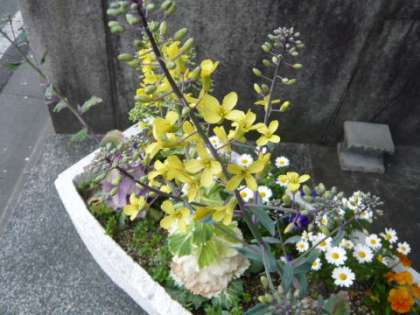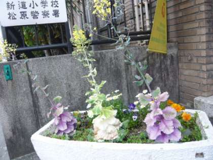 正月の観賞用にと,学校の大和大路通側玄関のプランターに植えられた「葉ボタン」が,ご覧のように成長しました。葉ボタンはやはりアブラナ科の植物,先の方はアブラナそっくりの黄色い花を咲かせています。