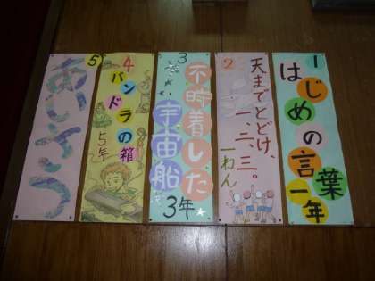 講堂の舞台の左右に,各学年の趣向を凝らしたプログラムが張られています。右側はプログラム番号1番から5番まで,左側は6番から11番までで,各学年のプログラムともに見応えがあります。