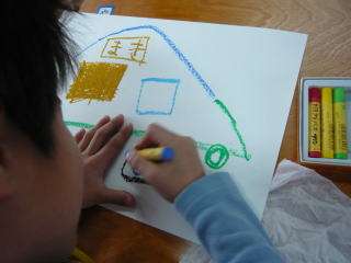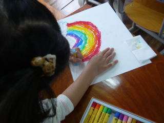 1・2時間目に1年生が図工で,好きなものや見つけたもの,あったらいいなと思うものを,思いのままに絵に描いていました。題名は「すきな もの なあに」,自分が描こうと思った「家」や「お城」,「虹」,「電車」,「スライム」などを,パスを使って上手に描いていました。