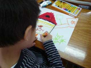1・2時間目の図工の時間に,パスを使って「すきな もの なあに」の絵を,上手に描きました。