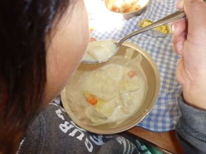 今日の給食は,「かぶらのクリームシチュー」でした。いつもは大根を使ったクリームシチューですが,今日は旬の「かぶら」を使ったシチューになっていました。,「かぶら」のとろけるような食感を味わうことができ,とってもおいしくいただきました。