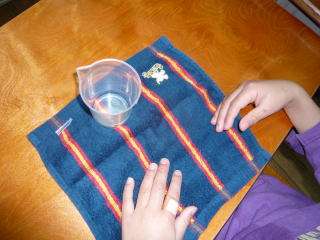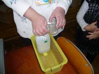 画像は左から,「コップを用意して」,「先生にコップを渡して」,「コップにうがい液が…」の順です。