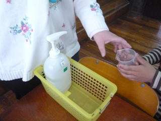 本校では毎週金曜日の始業前に,むし歯予防に効果があるとされている「フッ化物洗口」を実施しています。入学して2週間が過ぎた1年生も,先週は練習のため水を使ってフッ化物洗口の練習をしていましたが,今日から本格的にフッ化物洗口を始めました。コップに入ったうがい液を口に含んで「ブクブクブク」,上手に「ブクブクうがい」をすることができていました。