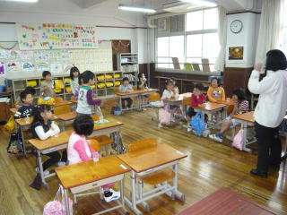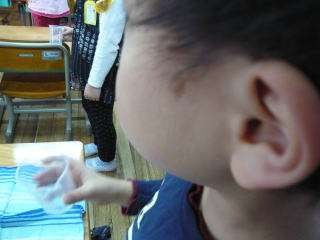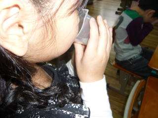 画像は左から,「うがい液を口に含んで」,「ブクブクブク」,「みんな上手にできました」です。