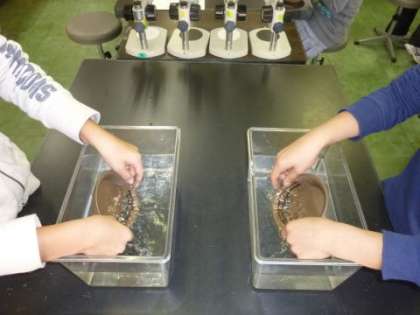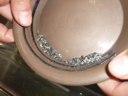 この日の学習も大詰め,「鉱石(鉱山の岩石)から金属鉱物を取り出す」ということを行いました。昔から行われている「水の中での比重の違い」を利用した方法で,金属鉱物を取り出しました。これは「わんがけ」という方法で,お皿の中に違う数種類の鉱物を入れて,水槽の水につけてお皿の水を出したり入れてたりして,比重の重いものを残しました。この「わんがけ」という方法は,砂金を取り出すのに大きな効果があったということです。