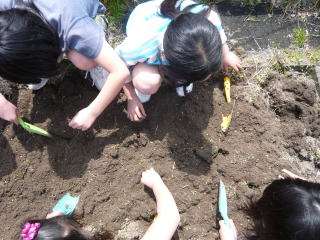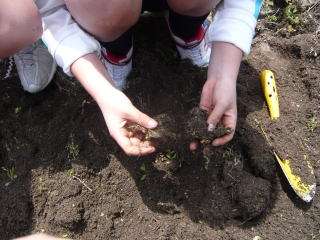 屋上にある学級園の畑の手入れを,4時間目に4年生がしていました。雑草を抜いたり,土を耕したり,肥料を入れたり,雑草には細かい根がいっぱい付いていてとっても抜きにくそうでしたが,協力してみんなでがんばって作業をしていました。この手入れした畑で,4年生の子どもたちは「ツルレイシ」と「ヘチマ」を育てる予定です。