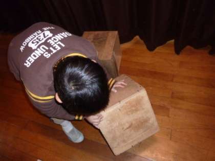 「たからさがし」のコーナーです。舞台につくられた宝が隠してある場所に行って,金銀のお宝を探し当てるゲームです。新聞紙だけでつくったお宝は,はずれになっていました。ルールは,「30秒以内に探し当てる」,「金銀でつくった宝があたり」などでした。30秒という短い時間では,なかなか宝を探し当てることはできませんでしたが,2つ以上の宝を探し当てている子も何人かいました。