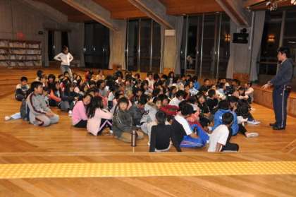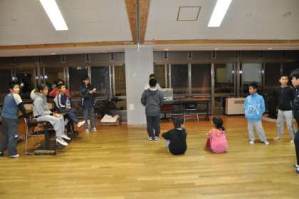 山の家での最後の夕食をおいしく食べ終わり,午後6時から最後の夜のお楽しみ「キャンプファイヤー」の出し物の練習を,班ごとに決められた場所で行いました。1時間後には,キャンプファイヤーが始まります。どの班も,必死になって練習を行いました。