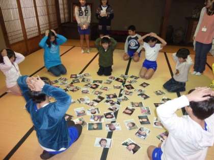 今日はAグループが,「ルンルンカルタ大会」を行いました。中間休みに作法室に集まったAグループの子どもたちは,読み札を読む児童会の役員からカルタ大会のルールを聞いたあと,手を頭の上に置いてカルタ大会が始まりました。76人全員の絵札が中央に置かれ,読み札が読み上げられるとすぐに,画像右のような状態になりました。