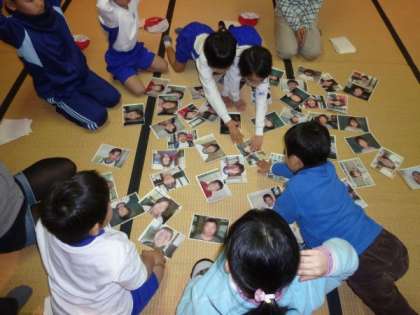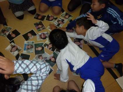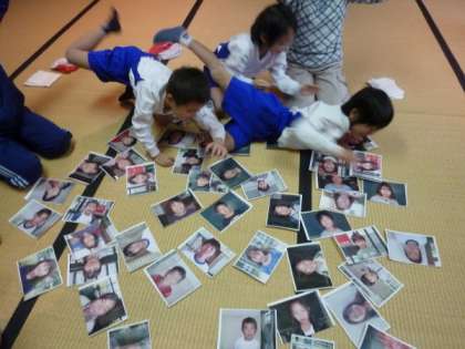 ルンルンカルタ大会が始まって間もなくは,みんな大変行儀よく,おとなしくカルタを行っていましたが,時間が経つにつれてだんだんと熱気を帯びてきて,体をいっぱいに使った激しい絵札の争奪戦が行われました。画像のように体操服を着た1・2年生も,中学年や高学年に負けることなく,絵札の争奪戦に加わっていました。