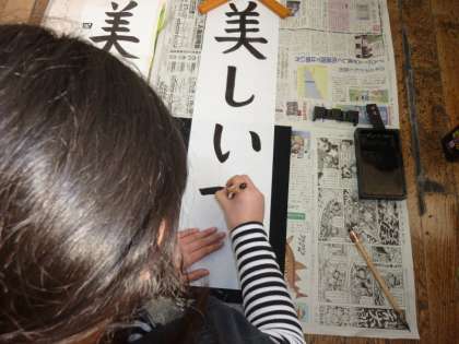 教室の床に新聞紙を敷き詰め,2列に向かい合わせになって,左手にお手本,右手に画箋紙を置いて,お手本をしっかりと見て,画箋紙に一筆一筆慎重に,「美しい朝」を書き進めていきました。