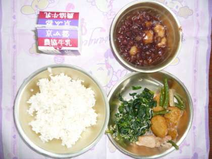 今日の給食の献立は,「麦ごはん」,「牛乳」,「平天とこんにゃくの煮つけ」,「ほうれん草とじゃこのいためもの」,「ぜんざい」でした。「につけ」,「いためもの」,「ぜんざい」ともに,とてもおいしくいただくことができました。