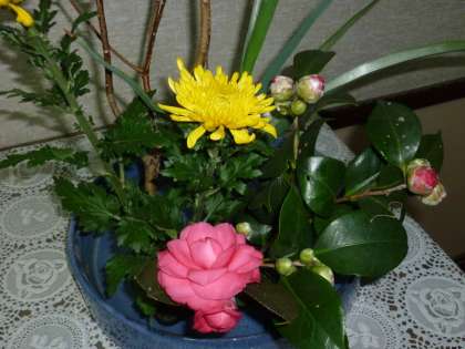 (今月の花材は,「三つまた」,「つばき」,「アイリス」,「菊」です。)