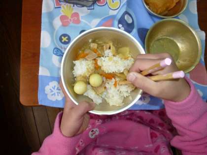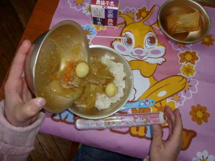 今日の給食は,「カレーあんかけごはん」でした。「カレーあんかけごはん」の具は,「豚肉」,「うずら卵」,「にんじん」,「たまねぎ」で,煮立ったスープの中にこれらの具材を入れて柔らかくなるまで煮込み,その後調理し,最後に片栗粉でとろみがつけてありました。いつも食べているカレーとはひと味違い,ごはんにかけてとてもおいしくいただきました。
