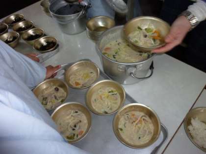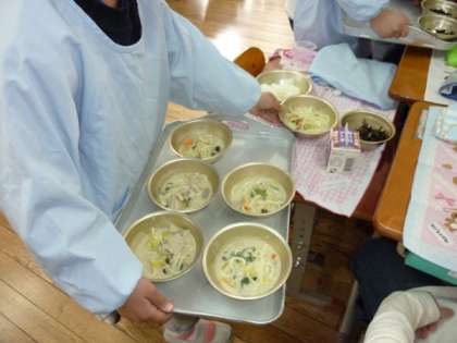 今日の給食は,今日のように寒い日にぴったりの「豆乳鍋」でした。