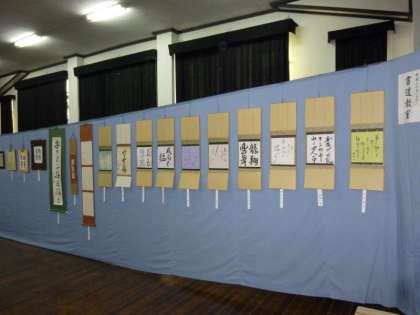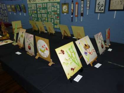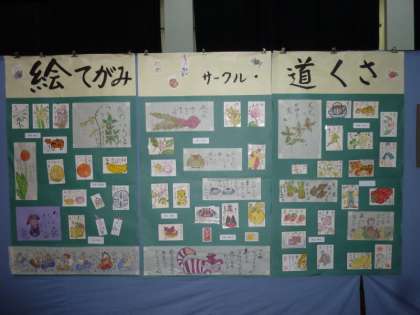 本校ふれあいサロンで活動されている,「書道教室」(画像上),「絵てがみ教室」(画像中),「飾り結び紐教室」(画像下)の作品を中心に展示されました。