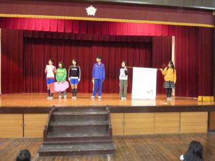 保健委員会からのお知らせから,「児童集会」は始まりました。保健委員会の子どもたちは,最初に,「給食で毎日食べている食べ物にはいろいろな人が関わっていること」や,「いのちがあった食べ物をいただいていることへの感謝の気持ちをもつこと」,などの話をしました。次に,「食べ物を粗末にしない」,「食器を大切に扱う」,「食べ物があることに感謝して,食べ物を大切に扱う」ことが大切だとまとめていました。(画像左)