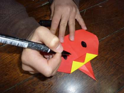 折り紙を折り進めること約10分で,「オニ」の顔が折り上がりました。折り上がった「オニ」の顔に,口や鼻,目,眉毛,角などをペンで描き入れました。笑っている顔や泣いている顔,怒っている顔など,様々な顔の「オニ」ができあがりました。今回の「つくって遊ぼう集会」も,大変楽しい集会となりました。6年生にとっては,リーダーとして最後の「つくって遊ぼう集会」でした。今日も,メンバーにしっかりと教えることができました。