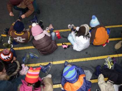 「京都アクアリーナ」に着くと,最初にスケート靴の借り方や返し方,リンクでのいろいろな注意事項を聞きました。荷物を観覧席に置いてからスケート靴に履き替えましたが,これが一苦労でかなりの時間を要しました。