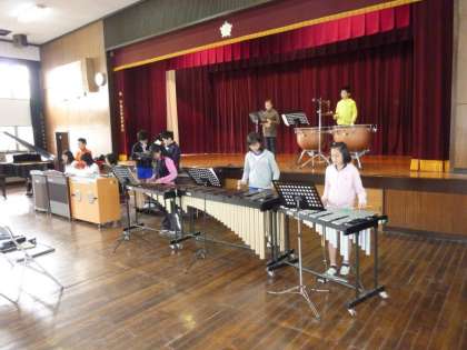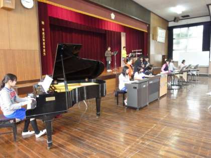 明日3月5日(金)5時間目に実施する「6年生を送る会」に向けて,6年生の子どもたちが講堂で合奏の練習をしていました。