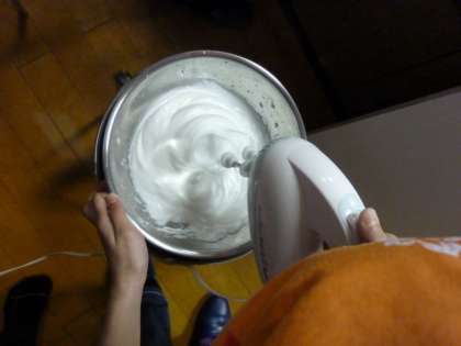 最初に卵を黄身と白身にわけ,黄身はお椀に入れ,白身はサラダボールに入れてかくはん機を使って,真っ白になるまでしっかりと泡立てました。