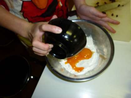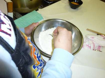 卵の白身をかくはんしている間に,乾燥イチジクを細かく刻んだり,小麦粉とベーキングパウダーを合わせたものに,黄身を入れて生地づくりをしました。
