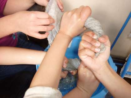 昼休みが終わって「校内クリーン作戦」が始まると,バケツに入った水に雑巾を入れ,しっかりと雑巾を絞って(画像左)拭き掃除をしました。高学年の子は高いところも軽々と拭き掃除(画像中)できましたが,低学年の子は椅子を踏み台にして拭き掃除(画像右)に励みました。