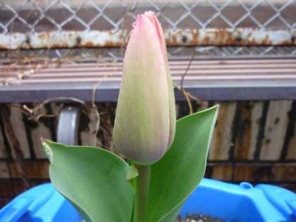 1年生が運動場の北西隅で育てている「チューリップ」が,ご覧のように大きく成長し,大きなつぼみをつけています。18鉢ある1年生の「チューリップ」ですが,このように大きく成長しているのは,まだ2鉢です。