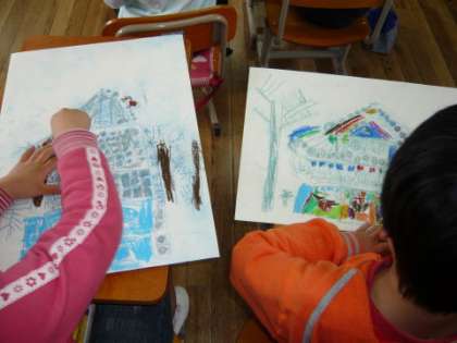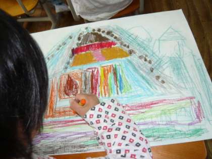 4月22日(水)に「建仁寺」で行った「写生会」の絵の仕上げを,各学年ともにがんばって行っています。建仁寺では下絵だけ描いてきましたので,今日1年生の子どもたちはクレパスを使って建物に色をつけたり,建物の周りの木や空などに色をつけたりしていました。この建仁寺の絵,間もなく仕上がって,5月31日(日)の日曜参観の際には,教室や階段の掲示板に飾られることと思います。