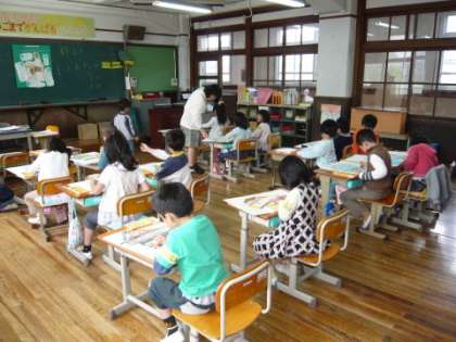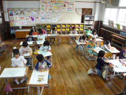 1年生の子どもたちががんばって,クレパスを使って写生会の絵の仕上げをしています。