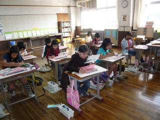 4月22日(水)に「建仁寺」で行った「写生会」の絵の仕上げを,各学年ともにがんばって行っています。建仁寺では下絵だけ描いてきましたので,今日4年生の子どもたちは絵の具を使って,瓦に入念に色をつけたり,建物に色をつけたりしていました。この建仁寺の絵,間もなく仕上がって,5月31日(日)の日曜参観の際には,教室や階段の掲示板に飾られることと思います。