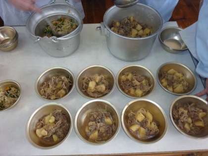 今日の給食は,子どもたちの大好きな「肉じゃが」でした。肉じゃがには,牛肉にじゃがいも,たまねぎ,糸こんにゃくが入り,三温糖と料理酒,濃口醤油で味付けされ,とってもおいしくいただくことができました。