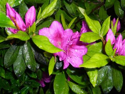 大和大路通講堂東の桜「ソメイヨシノ」は,花びらをすべて落として葉桜となりましたが,その下に育つ「ツツジ」が開花し出しました。今日確認したところ,雨に濡れて生き生きとした,数輪のツツジの花が咲いていました。満開までには,まだ日数が必要なようです。満開になれば,またお伝えしたいと思います。