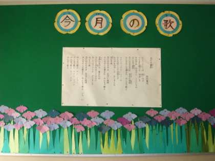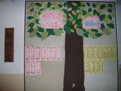 クラブの広場の大掲示板(画像左)は「ショウブ」の花が咲き,5月の今月の歌「友だち賛歌」の歌詞が張られ,新道の木の掲示板(画像右)には「やさしさいっぱい 新道の子」のスローガンと,2年生と4年生の人権標語の短冊が張り出されました。(1・3・5・6年生については,後日張り出されます。)