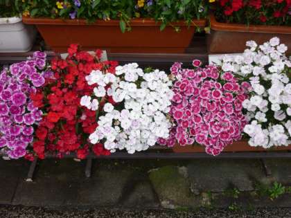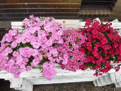 学校の東側,大和大路通沿いに並べられたプランターに,赤やピンク,紫,白などの「ナデシコ」の花が美しく咲き競っています。