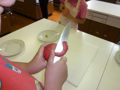 4月の終わりに6年生に,リンゴの皮のむき方を教わった5年生の子どもたちが,家庭科室で「リンゴの皮むき大会」を行いました。