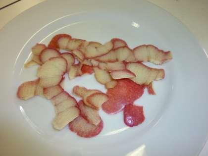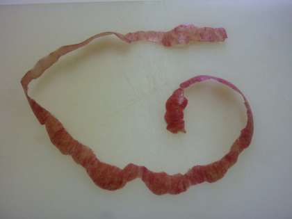 画像左でご覧のように,5分間を待たずにきれいにリンゴの皮をむいた子も,少なからずいました。画像中は何回も何回もちぎれてしまったリンゴの皮,画像右は一番長くむけたリンゴの皮です。