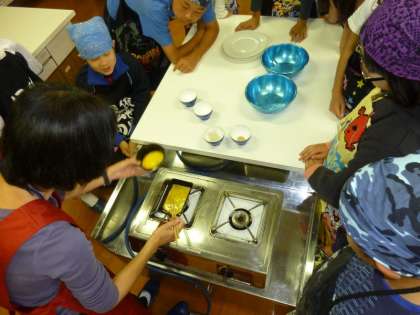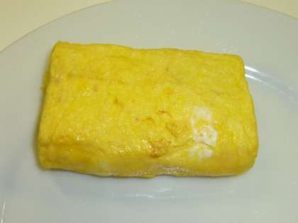 卵焼きづくりを始める前に,担任の先生から栄養や食品添加物などの話や,卵焼きのおいしい作り方の話などを聞きました。次に,卵焼きの作り方を,実際に見せてもらいました。手際よくていねいに卵が焼かれ,画像右のような,直方体のふっくらとしたおいしそうな卵焼きができあがりました。実演を見ていた子どもたちから,「そら,主婦やもんな!」の声が…。