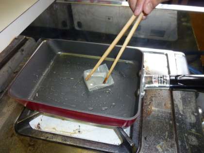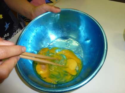 担任の先生の「卵焼き」に圧倒された6年生の子どもたちですが,気を取り直して「卵焼き」づくりに挑戦しました。各グループ6個ずつ卵を渡され,3個を使って2つの卵焼きをつくります。最初にボールに卵をていねいに割って入れ,それをしっかりとかき混ぜました。かき混ぜている間に,手の空いている子は,卵焼き器にペーパータオルにしみ込ませた油を十分に引きました。