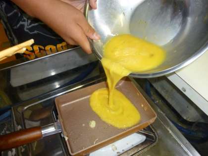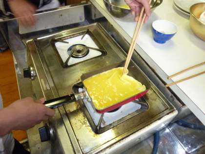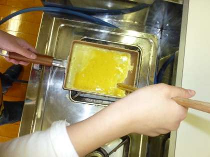 卵焼き器に卵が流し込まれ,いよいよ「卵焼き」の開始です。担任の先生のように手際よくとはいきませんが,卵を焦がさないように気をつけて,ていねいに卵を焼いていきました。