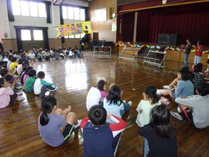 3時間目が始まる少し前に,1年生は講堂前に,2〜6年生は講堂の決められた場所に集まって,「1年生を迎える会」が始まるのを待ちました。3時間目の始まりの午前10時50分,大きな手拍子の中を1年生が講堂に入場しました。