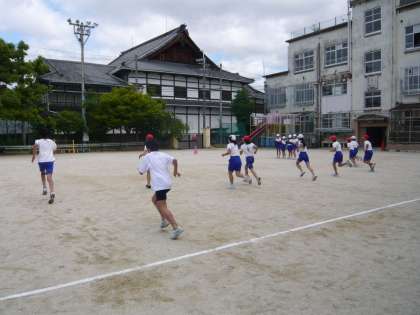 シャトルランは,20m間隔の2本の平行線を,電子音を合図に行き来します。電子音の間隔は,初めはゆっくりですが,約1分ごとに早くなり,設定された速度を維持できなくなると,その子のシャトルラン(往復持久走)が終了します。5・6年生の子どもたちは,ウォーミングアップを十分に行って,がんばってシャトルランに挑んでいました。