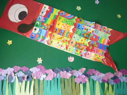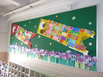 5月の大掲示板は,下の方には「ショウブ」の花が咲き競い,空を赤と黄の「こいのぼり」が泳いでいます。この「こいのぼり」は,1年生を迎える会の時に講堂に飾られたもので,新道小学校の子どもたち一人一人が描いた,小さな「こいのぼり」が鱗(うろこ)になっています。