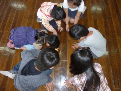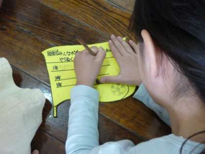 集合が終わると,なかよしグループごとに円をつくって座り,リーダーが書いたグループのめあてを確認したり,めあてが書かれた用紙に名前を記入したり,自己紹介をし合ったりしました。