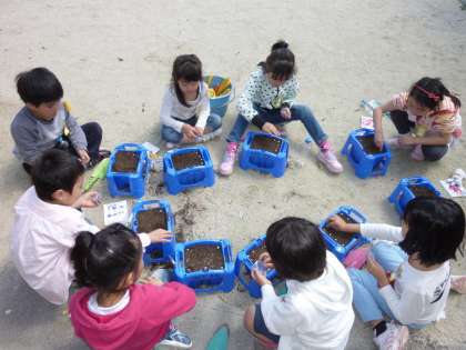 アサガオの種まきは一人一鉢ずつで,青色の鉢に担任の先生から土を入れてもらい,指で小さな穴を4つ開けて一粒ずつ4つの種をまきました。粒のこやし(肥料)を種をまいた周りに置いて,水をあげて種まきの完了。天気のよい日は,毎日水をあげて世話をします。しっかりとがんばって育てて,大きな美しいアサガオの花が咲くのが楽しみです。