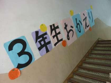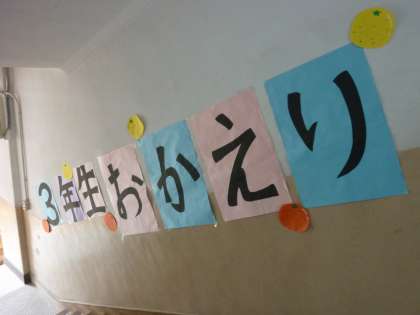 中央階段の1階から2階に上がる途中の壁に,昨日突然出現した「3年生 いってらっしゃい」の掲示が,今日の午後には「3年生 おかえり」の掲示に貼り変わっていました。