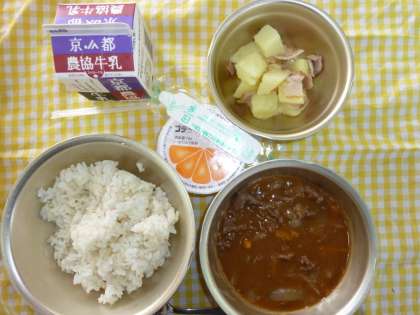 今日の給食の献立は,「麦ごはん」,「牛乳」,「ハッシュドビーフ」,「ジャーマンポテト」,「みかんゼリー」でした。「じゃがいも」と「ベーコン」を,サラダ油,塩,こしょうで味付けされた「ジャーマンポテト」が「ハッシュドビーフ」にとても合っていて,ハッシュドビーフとともにおいしくいただきました。また,今日は「みかんゼリー」がデザートについていて,子どもたちは大喜びでした。
