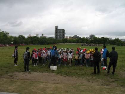 「梅小路公園」には,午前9時40分に到着しました。梅小路公園に到着するとすぐに芝生広場に集まってご挨拶,続いてこの日1日行動をともにするグループに分かれました。この日のグループは,5校の3年生がすべて入っていました。