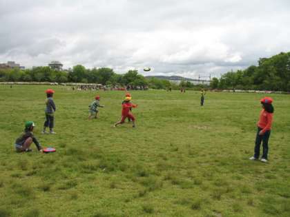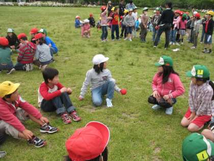 午前中の活動の開始です。最初にグループごとに円をつくって座り,自己紹介をし合ったり,簡単なゲームをしたりしました。続いてオリエンテーリング,8つのポイントをグループで協力して回っていきました。ポイントでは,「グループのみんなの年齢を全部たすと,いくつになりますか。」や「「春の小川」をみんなで歌いなさい。」,「新幹線はどの方角に見えるでしょう。」などの問題が出されました。オリエンテーリングが早く終わったグループは,フリスビーや大縄とびなどをして,仲よく芝生広場で遊びました。