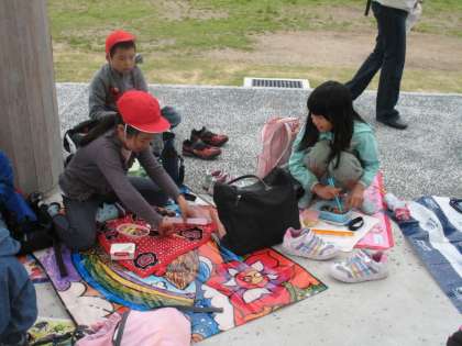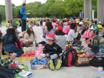楽しくオリエンテーリングをしたり,グループ遊びをしたりしたあとは,お楽しみのお弁当の時間でした。グループごとに敷物を敷いて座り,仲よくおいしいお弁当を食べました。お弁当を食べ終わったあとで,5校の3年生全員で集合写真を撮ったり,グループごとの写真を撮ったりしました。